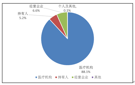 持有人、經(jīng)營企業(yè)和醫(yī)療機(jī)構(gòu)是藥品不良反應(yīng)報告的責(zé)任單位。按照報告來源統(tǒng)計,2019年來自醫(yī)療機(jī)構(gòu)的報告占88.1%;來自經(jīng)營企業(yè)的報告占6.6%;來自持有人的報告占5.2%;來自個人及其他報告者的報告占0.1%(圖3)。