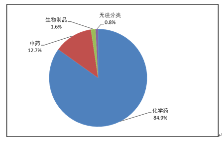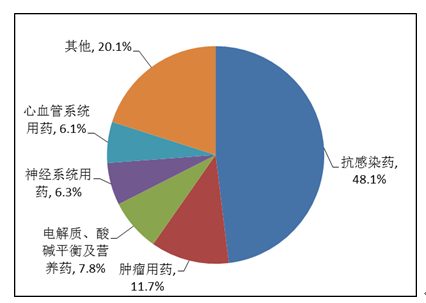 按照藥品類別統(tǒng)計,化學(xué)藥品占86.6%,中藥占12.6%,生物制品占0.8%?;瘜W(xué)藥品排名居前的藥品類別是抗感染藥、心血管系統(tǒng)用藥、腫瘤用藥、神經(jīng)系統(tǒng)用藥、電解質(zhì)、酸堿平衡及營養(yǎng)藥;中藥排名居前的藥品類別是理血劑、補(bǔ)益劑、祛濕劑、開竅劑、清熱劑。